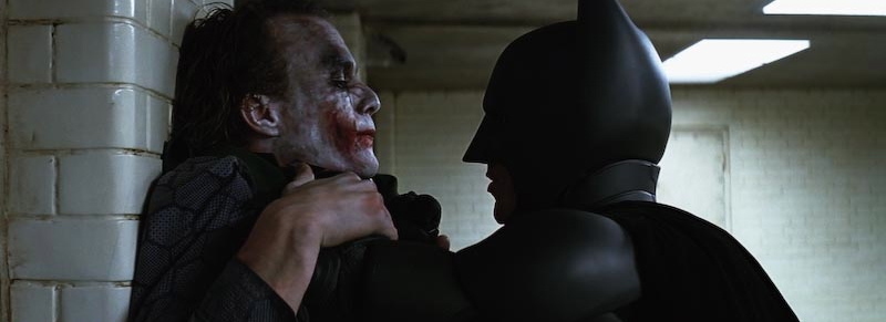DarkKnight29Interrogation Published September 1, 2012 at 800 × 291 in Top Ten Dark Knight Legend Scenes ← Previous Next → Heath Ledger (The Joker) tells Christian Bale (Batman) that he has captured both Harvey and Rachel. He also Batman that he has to choose between them.